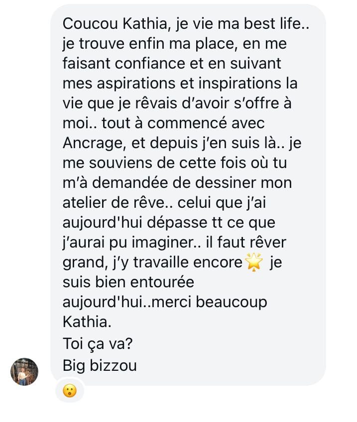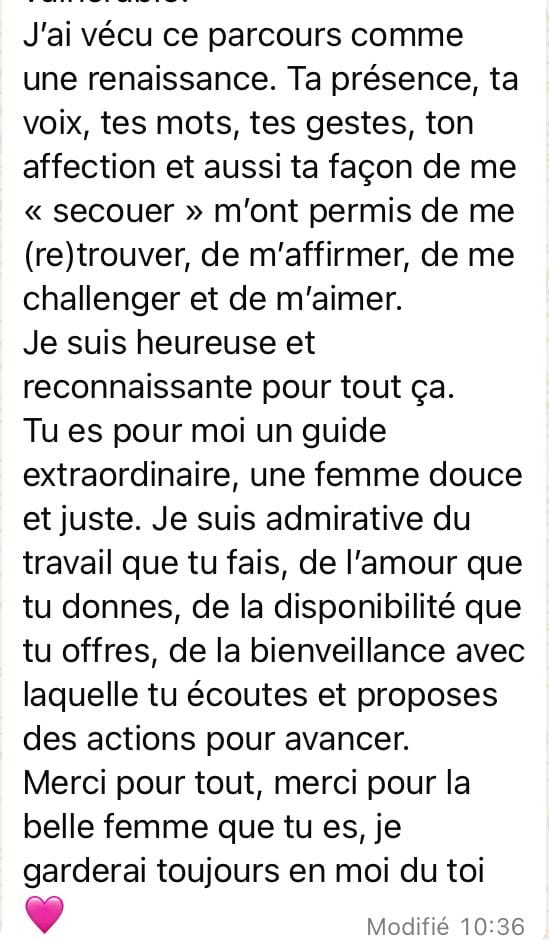 Après un cheminement personnel, fait de recherches, d’introspection, de questionnements, de thérapies et de coaching, j’ai choisi, en 2015, de me lancer dans ce qui m’appelait déjà à l’adolescence : accompagner les humains, plus particulièrement les femmes à se sentir souveraines et libres.