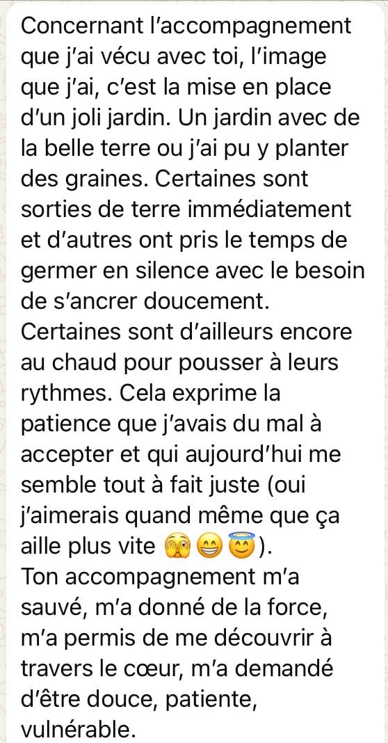 Nous poserons notre bulle de confort pour les 9 mois pour prendre soin, vivre ce voyage ensemble sous le signe de la bienveillance, du respect et de la confidentialité. C'est le présent qui sera notre guide pour cheminer.